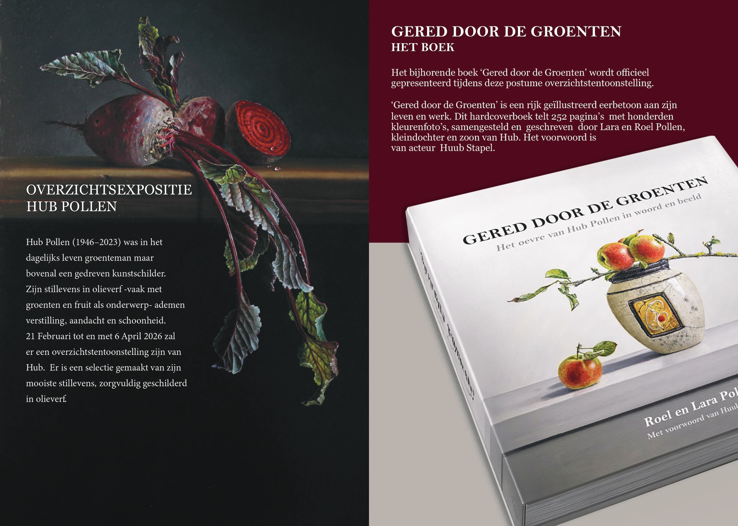 Om 14.00 uur vindt de presentatie plaats van het boek “ Gered door de groenten” over wijlen Hub Pollen, een uitgave die met grote toewijding werd samengesteld door zijn zoon Roel en kleindochter Lara. Dit boek vormt een liefdevol eerbetoon aan een kunstenaar die met zijn werk een blijvende indruk heeft achtergelaten. In de galerie zijn momenteel maar liefst veertig werken van zijn hand te bewonderen. Samen bieden zij een indrukwekkend en veelzijdig overzicht van zijn oeuvre, waarin zijn karakteristieke vormentaal en artistieke bevlogenheid krachtig naar voren komen.