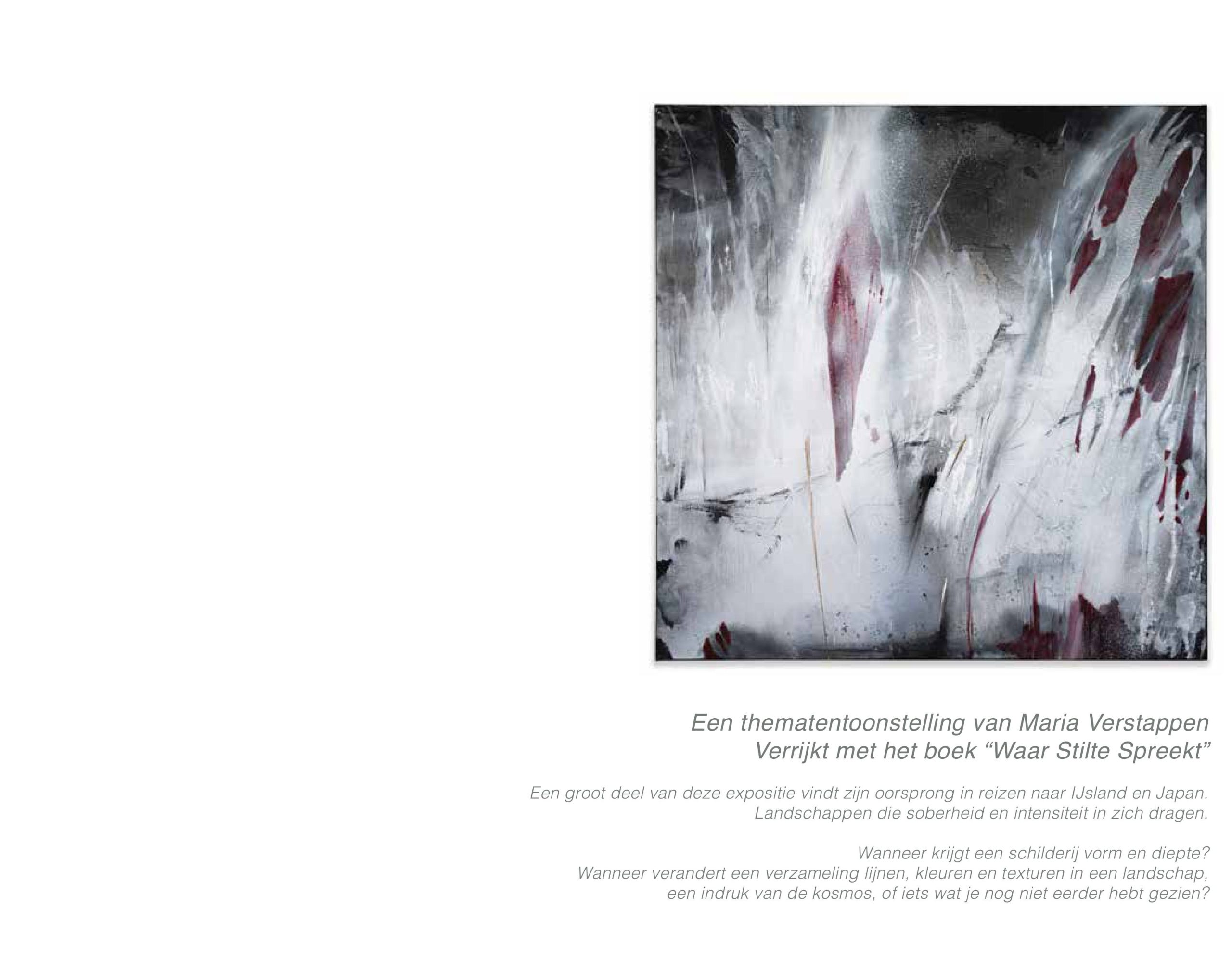 Op zaterdag 11 april vanaf 14.00 uur wordt het boek “Waar stilte spreekt” van Maria Verstappen feestelijk gepresenteerd. Een prachtig oeuvre waarin haar werk centraal staat. Tijdens deze bijzondere gelegenheid worden bovendien zo’n 30 van haar schilderijen tentoongesteld, onder het genot van een hapje en een drankje.