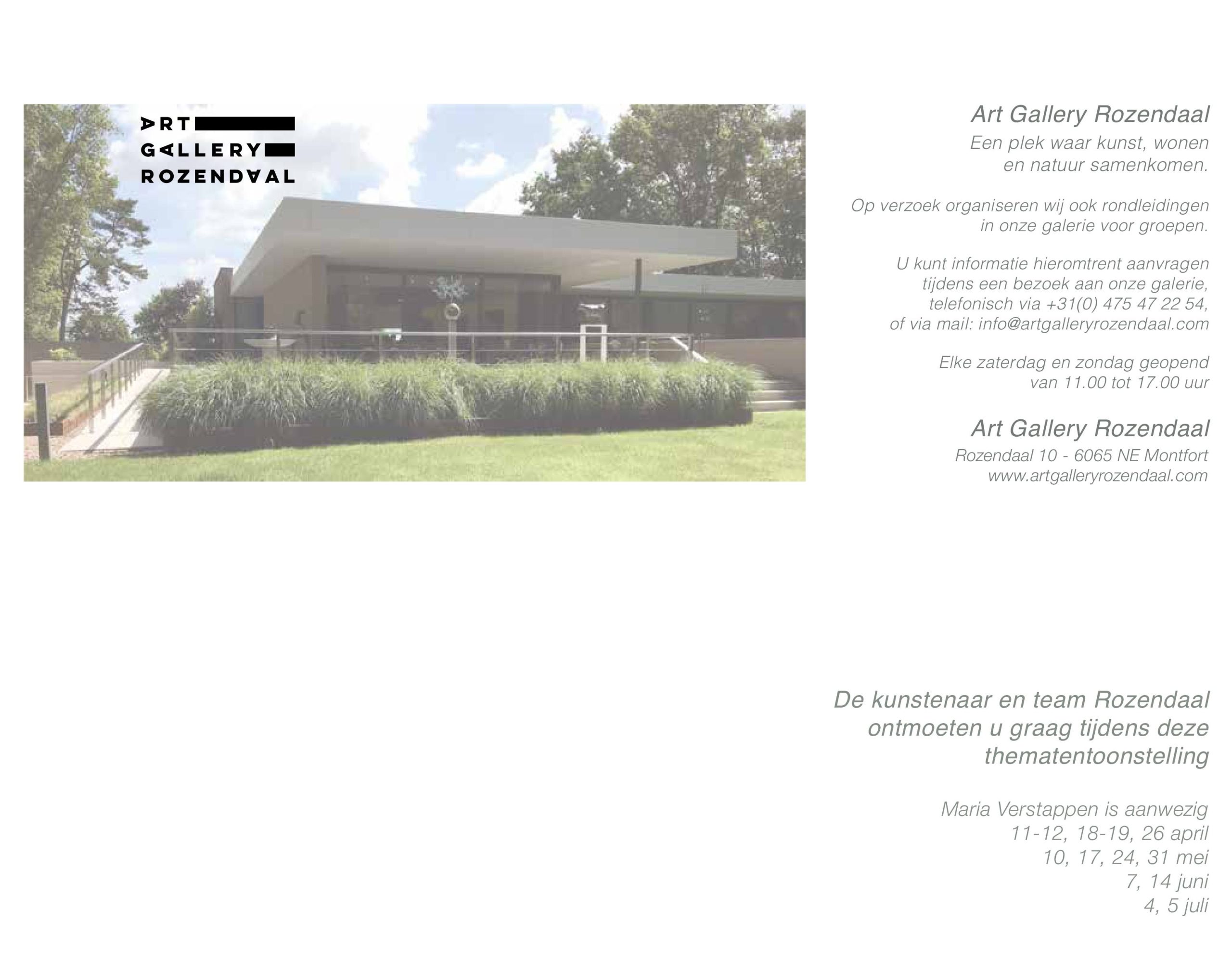Donderdag 14 mei 2026, Hemelvaartsdag en het Pinksterweekend (23-24 en 25 mei) inclusief Pinkstermaandag is de galerie geopend van 11.00 tot 17.00 uur.